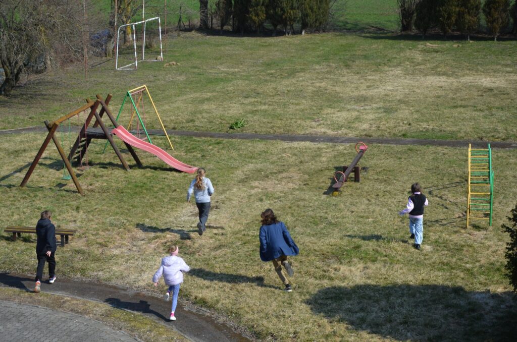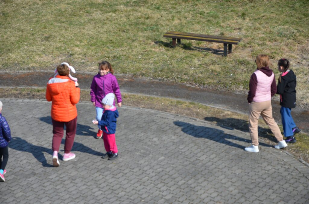 A kiedy opowieść dobiegła końca… przenieśliśmy się na plac przy bibliotece, gdzie czekała prawdziwa niespodzianka! Wśród trawy ukryły się zajączki, które zostawiły coś specjalnego. Poszukiwania wywołały mnóstwo emocji, śmiechu i dziecięcej ekscytacji – a znalezione skarby sprawiły wszystkim ogromną radość!