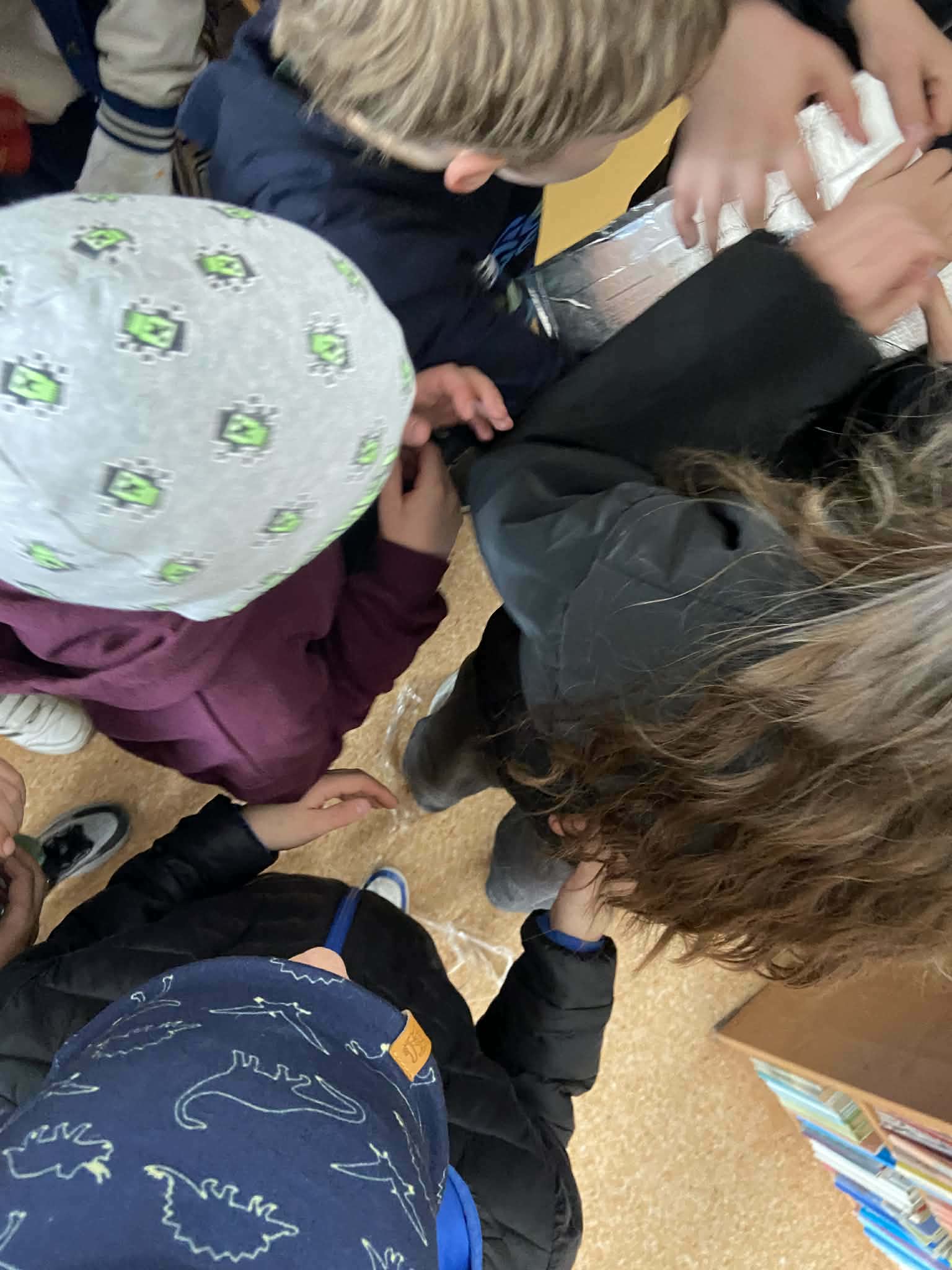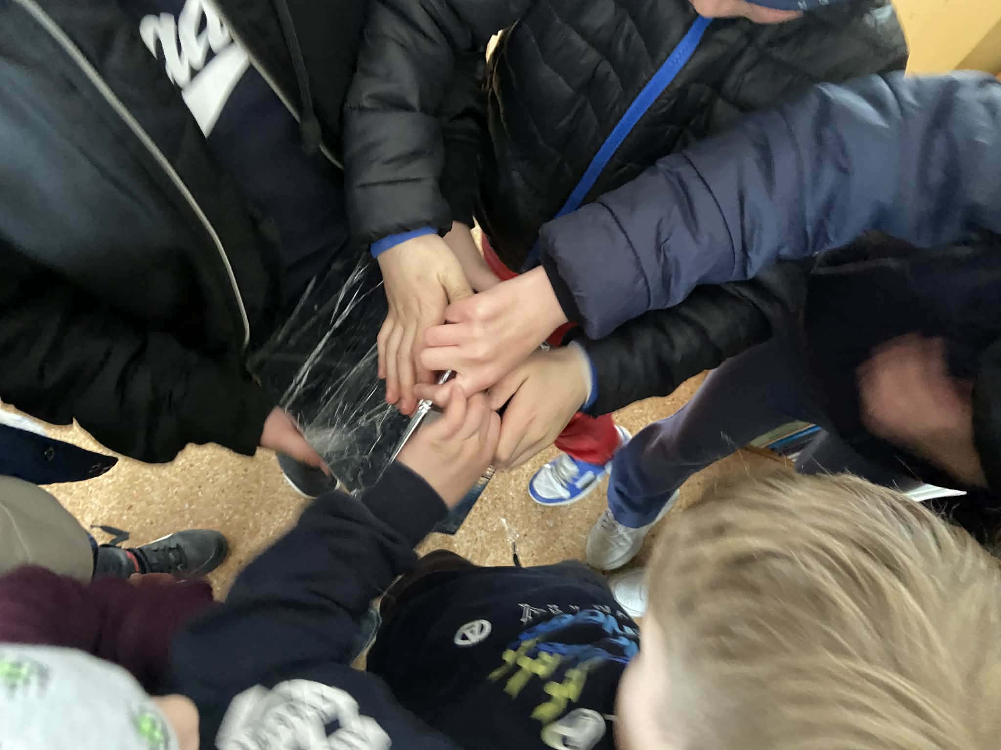 Po odnalezieniu „bomby” przyszedł czas na jej symboliczne „rozbrojenie”. Zadanie zostało wykonane wspólnie, a w środku znajdowała się słodka niespodzianka – cukierki, którymi uczestnicy podzielili się między sobą.